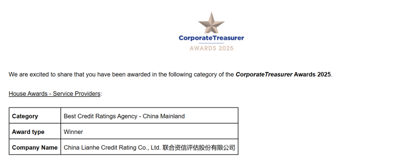 近日,Haymarket媒體集團(tuán)旗下的《企業(yè)財資人》(CorporateTreasurer)公布了2025年年度獎項評選結(jié)果。聯(lián)合資信評估股份有限公司(以下簡稱“聯(lián)合資信”)以領(lǐng)先的市場地位,突出的業(yè)務(wù)亮點,以及出色的投資人服務(wù)能力,再次獲得“中國大陸地區(qū)最佳信用評級機(jī)構(gòu)”獎。這是繼2025年4月贏得《亞洲金融》(FinanceAsia)頒發(fā)的“2025年度最佳信用評級機(jī)構(gòu)”獎后,公司獲得的又一重要國際獎項。