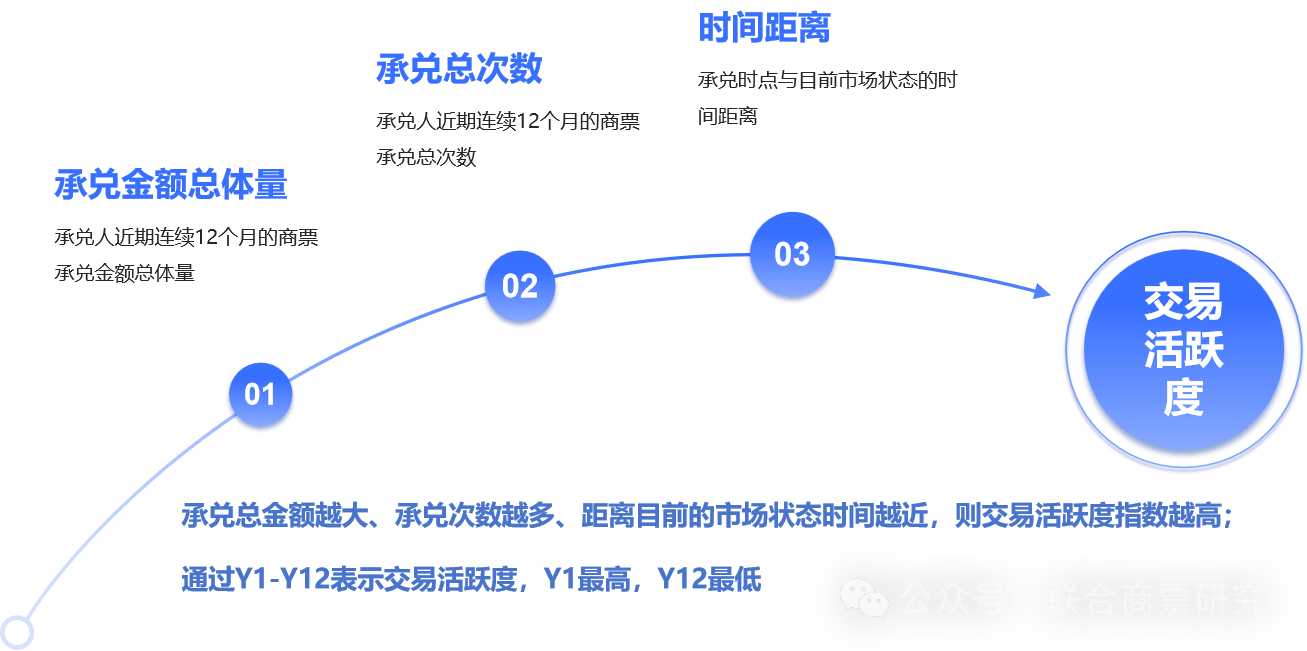 交易活躍度的構(gòu)建基于承兌人近期連續(xù)12個(gè)月內(nèi)商票承兌總體量、商票承兌總次數(shù)建立的二維排序,同時(shí)考慮承兌時(shí)點(diǎn)與目前市場(chǎng)狀態(tài)的時(shí)間距離。承兌總金額越大、承兌次數(shù)越多、距離目前的市場(chǎng)狀態(tài)時(shí)間越近,則交易活躍度指數(shù)越高。